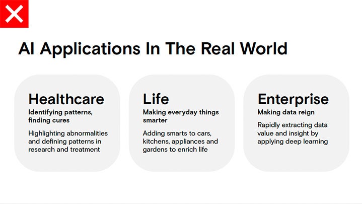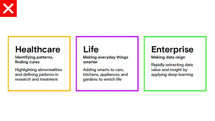 When using color blocking, keep at least half of the touchpoint background either white or black. Content with color blocks should have sharp square corners, not rounded ones.